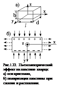 При деформации некоторых кристаллических, не имеющих центра симметрии, полярных диэлектриков (включая все сегнетоэлектрики) была обнаружена электрическая поляризация. Это явление было открыто и первоначально изучено братьями П. и Ж.Кюри в 1880 г., и получило название пьезоэлектрического эффекта. Наиболее подробно этот эффект изучен у кристаллов кварца, турмалина, сахара, сегнетовой соли, борацита и др. Рассмотрим пьезоэлектрические свойства кристалла кварца. Главная ось кристалла Z (рис.1.22 а) называется оптической осью. Из кристалла вырезается пластинка в виде прямоугольного параллелепипеда, у которого ребро b (высота) - параллельна Z, ребра l (длина) и d (толщина) - параллельны осям x и y.