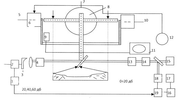 1. Синхрогенератор 2. Лазер (в режиме Q-модуляции) 3. Коллиматор (параллельный пучок лучей) 4. Автоматический аттенюатор (передающее устройство) 5. Ось угломестная 6. Привод 7. Азимутальная ось 8. Поворотное зеркало 9. Видео визир 10. Датчик 11. Видео контрольное устройство (ВКУ) 12. Ручка управления приводами 13. Автоматический аттенюатор 14. Интерференц. (полосовой) фильтр 15. Пеленгатор 16. Переключатель каналов 17. Накопитель 18. Приемник дальномерного канала 19. Устройство измерения дальности 20. Зеркало приемного телескопа JIJIC PATS состоит из инфракрасного лазерного передатчика с рабочей длиной волны λ = 1,06 мкм приемного устройства, инфракрасного телевизира с ВКУ, опорно- поворотного устройства и устройства обработки регистрации результатов измерения. В начале оператор с помощью ВКУ, сопряженного с телевизиром, ведет поиск цели, для этого ручка управляет приводами, которые вращая поворотное зеркало ориентируют оптическую ось системы в пространстве.