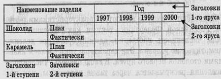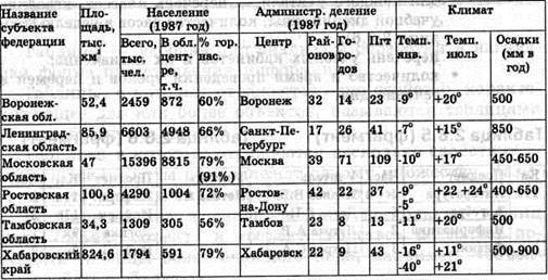 Таблицы — удобная для анализа и обработки, наглядная и привычная форма представления информации. Поэтому большинство автоматизированных баз данных имеет табличный или реляционный (от англ. relation — отношение) тип. Этапы построения таблицы (приведения информации к табличной форме) разберём на следующем примере. Переведём словесное описание характеристик нескольких регионов Российской Федерации, взятое из географического энциклопедического словаря, в табличную форму Ростовская область - Пл. 100,8 т.км. Нас. 4290 т.ч. (1987; в Ростове-на-Дону 1004 т.ч.), гор. 72%. 42 адм. р-на, 22 города, 37 пгт (1987). Центр — Ростов-на-Дону. Ср. темп-ры января от -9 °С до -5 °С, июля 22-24 °С. Осадков 400-650 мм в год. Московская область - Пл. 47 т.км. Нас. 6581 т.ч. (1987; с Москвой 15396 т.ч<); гор. 79% (с учетом нас. Москвы 91%). 39 адм. р-нов, 71 город, 109 пгт (1987). Центр — Москва. Ср. темп-ры января -10 "С, июля 17 °С. Осадков 450-650 мм в год. Тамбовская область - Пл. 34,3 т.км. Нас. 1309 т.ч. (1987; в Тамбове 305?-ч.), гор. 56%. 23 адм. р-на, 8 городов, 13 пгт (1987). Центр — Тамбов. Ср. темп-ры января -11 °С, июля 20 °С. Осадков 500 мм в год. Воронежская область - Пл. 52,4 т.км. Нас. 2459 т.ч. (1987; в Воронеже 87 т.ч.), гор. 60%. 32 адм. р-на, 14 городов, 23 пгт (1981/)- Центр — Воронеж. Ср. темп-ры января -9 °С, июля 20 °С. Осадков 500 мм в год. Ленинградская область. Пл. 85,9 т.км. Нас. 1655 т.ч. (1987; с Санкт-Петербургом 6603 т.ч.), гор. 66%. 17 адм. р-нов, 26 городов, 41 пгт (1987). Центр — Санкт-Петербург. Ср. темп-ры января -7 °С, июля 15 °С. Осадков 850 мм в год. Хабаровский край. Пл. 824,6 т.км. Нас. 1794 т.ч. (1987; в Хабаровске 591 т.ч.), гор. 79%. 22 адм. р-на, 9 городов, 43 пгт (1987)- Центр — Хабаровск. Ср. темп-ры января от -16 °С до ~40 °С, июля 11-21 °С. Осадков 500-900 мм в год. Приведённые данные являются характеристиками регионов Российской Федерации» такими как: название, площадь, численность населения, административное деление, климатические условия. Эти характеристики сделаем названиями столбцов первого яруса. В свою очередь, численность населения раскрывается через такие параметры, как численность общего населения, численность населения центрального города, процент городского населения; «административное деление» включает в себя количество административных районов, количество городов и посёлков городского типа, название областного (краевого) центра; «климатические условия» описываются такими свойствами, как средние температуры января и июля и среднегодовое количество осадков. Перечисленные характеристики сделаем заголовками столбцов второго яруса. Всего столбцов в таблице будет 12. Кроме строк заголовка таблица будет содержать еще 6 строк для описания 6 субъектов федерации. В качестве заголовков строк лучше всего использовать названия регионов. Разместить записи можно в разном порядке, например, в порядке убывания общего количества жителей (первой будет Московская область, последней — Тамбовская) или занимаемой площади (первым будет Хабаровский край, последней Тамбовская область), но лучше использовать алфавитный порядок. Таблица 4 Характеристики регионов Российской Федерации