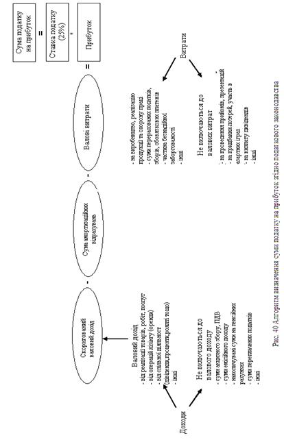 Рис. 39 Класифікація різниці між податковим і обліковим прибутком Постійна різниця – різниця між податковим і обліковим прибутком за певний період, який виникає в поточному звітному періоді і не анулюється в подальших звітних періодах. Тимчасова різниця – різниця між оцінкою активу або зобов'язання за даними фінансової звітності і їх податковою базою. Податкова база активу і зобов'язання – оцінка активу або зобов'язання, використовувана в цілях оподаткування цього активу і зобов'язання при визначенні податку на прибуток. Тимчасова різниця, у свою чергу|своєю чергою|, ділиться на: – тимчасову різницю, що підлягає відніманню (що не підлягає оподаткуванню) - що приводить в майбутніх періодах до зменшення податкового прибутку (збільшенню збитку); – тимчасову різницю, що підлягає оподаткуванню, - що включається в податковий прибуток (збиток) в майбутніх періодах. Таким чином, за наявності тимчасової різниці між бухгалтерським (обліковим) і податковим прибутком виникає відстрочений податок. Якщо виключити з бухгалтерського прибутку постійну різницю, то порівняння облікового прибутку і податкового дасть показник тимчасової різниці, з якою необхідно нарахувати відстрочений податок, помноживши цю різницю на ставку податку на прибуток. Алгоритм визначення суми податку на прибуток згідно закону України "Про оподаткування прибутку підприємства" приведений на рис. 40.