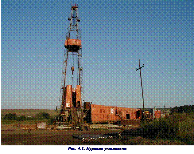 Буровая установка – это комплекс буровых машин, механизмов и оборудования, смонтированный на точке бурения и обеспечивающий с помощью бурового инструмента самостоятельное выполнение технологических операций по строительству скважин. Современные буровые установки включают следующие составные части: - буровое оборудование (талевый механизм, насосы, буровая лебедка, вертлюг, ротор, силовой привод и т.д.); - буровые сооружения (вышка, основания, сборно-расборные каркасно-панельные укрытия приемные мостки и стеллажи); - оборудование для механизации трудоемких работ (регулятор подачи долота, механизмы для автоматизации спуско-подъемных операций, пневматический клиновой захват для труб, автоматический буровой ключ, вспомогательная лебедка, пневмораскрепитель, краны для ремонтных работ, пульт контроля процессов бурения, посты управления); - оборудование для приготовления, очистки и регенерации бурового раствора (блок приготовления, вибросита, песко- и илоотделители, подпорные насосы, емкости для химических реагентов, воды и бурового раствора); - манифольд (нагнетательная линия в блочном исполнении, дроссельно-запорные устройства, буровой рукав); - устройства для обогрева блоков буровой установки (тепло генераторы, отопительные радиаторы и коммуникации для развода теплоносителя). Состав и компоновка буровой установки показаны на рис. 4.1.