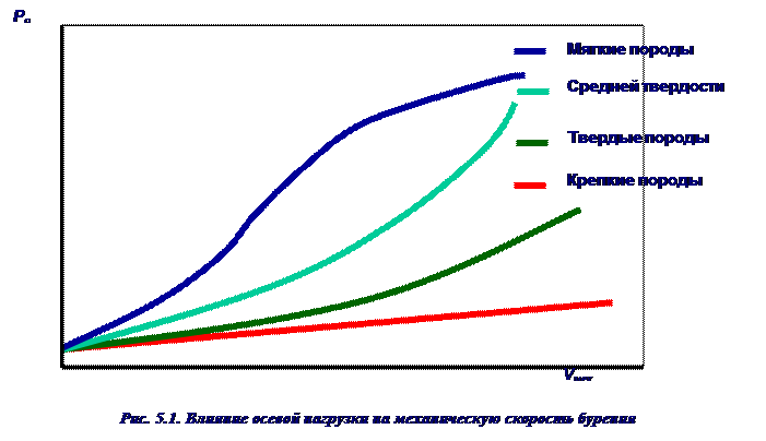 Разрушение горной породы на забое механическим способом невозможна без создания осевой нагрузки на долото. На рис. 5.1. показана зависимость механической скорости бурения Vм от осевой нагрузки G на трёхшарошечное долото при проходке мягких (кривая 1), средней твёрдости (кривая 2), твёрдых (кривая 3) и крепких (кривая 4) пород при неизменной низкой (до 60 об/мин) частоте вращения и достаточной промывке за короткий промежуток времени, когда изнашиванием долота можно пренебречь.