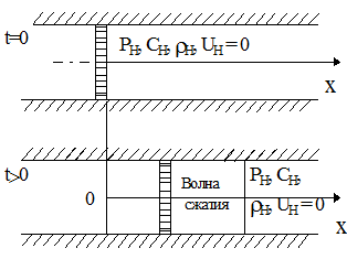 то он оторвется от газа и газ будет свободно истекать в пустоту. Задача. Одностороннее истечение ранее покоящегося газа в пустоту. Представим себе очень длинную трубу, перегороженную где-то в середине перегородкой. Пусть область слева от перегородки заполнена покоящимся газом с параметрами Pн, r н , cн , uн = 0, а справа от перегородки — пустота. Ось ox направим параллельно оси трубы, начало координат пусть будет в том месте, где находится перегородка. Площадь сечения трубы постоянна и принимается равной единице (рис. 3.13).