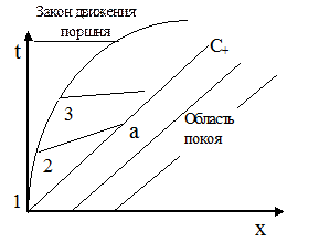 На границе с поршнем скорость газа совпадает со скоростью поршня uп, направление которой отрицательно относительно оси x. Скорость звука, а также давление и плотность газа у поршня меньше начальных, притом тем меньше, чем скорее движется поршень. Характеристики C+ являются прямыми линиями, выходят с линии поршня (возмущения возникают на поршне) и имеют наклоны
