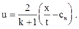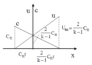 поскольку она движется в положительном направлении оси ox, хотя направление массовой скорости газа при этом противоположно. Определим значение константы в системе (3.65). Для этого воспользуемся граничными условиями на фронте волны разрежения: u = 0, c = cн. Тогда получим