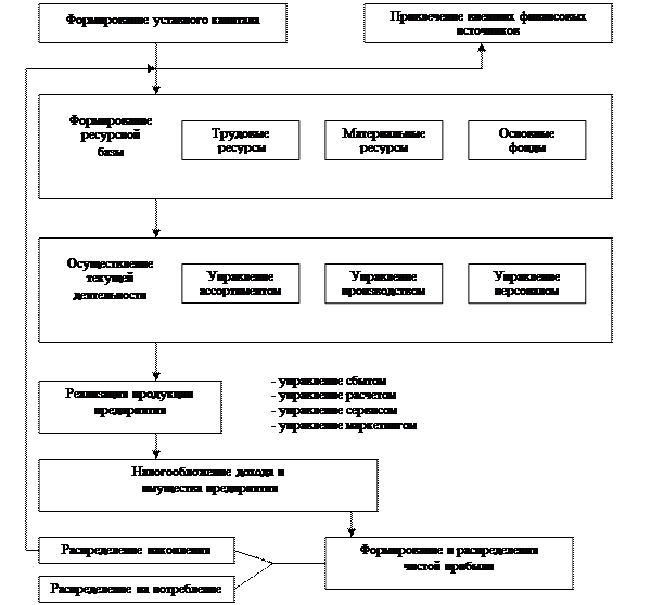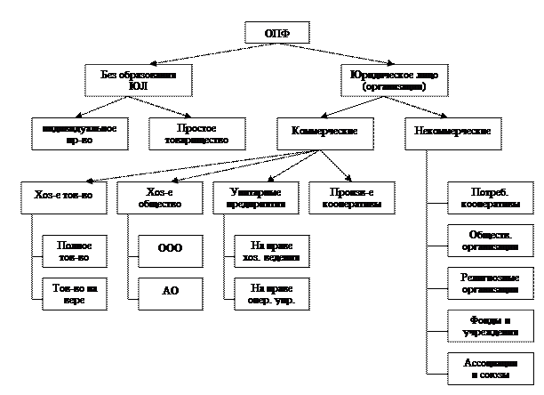 Рисунок 2 – Схема хозяйственного механизма предприятия Из схемы видно, что значительное влияние на эффективность предприятия оказывает порядок формирования начального капитала и порядок распределения чистой прибыли. Оба вопроса, а также отношение собственности внутри предприятия, регламентируются в зависимости от организационно-правовой формы. Принимаемая в Российской Федерации система организационно-правовых форм (ОПФ) хозяйственной деятельности, введенная Гражданским Кодексом, включает в себя две формы без образования юридического лица, шесть видов коммерческих организаций и целый ряд некоммерческих организаций (список которых является открытым, то есть не установлен ГК).