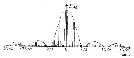 Интенсивность главных максимумов в N2раз больше чем интенсивность в этом направлении φ от одной щели. Между главными максимумами наблюдаются вторичные максимумы, разделенные добавочными минимумами. В дифракционной картине для направлений φ, удовлетворяющих условию a sin φ = m λ0, наблюдаются главные минимумы. На рис. 5.6 приведено распределение интенсивности света решеткой с N = 4 и d / a = 3. При весьма большом числе щелей картина на экране будет представлена узкими очень яркими полосками, разделенными почти темными промежутками, ибо вторичные максимумы очень слабы по сравнению с главными. Расстояние между главными максимумами возрастает с уменьшением периода решетки d = (a + b).