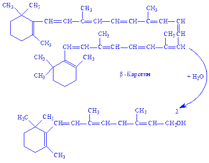 Спиртові групи ретинолу і дегідроретинолу вступають в реакції окислення, етерифікації, відновлення, внаслідок чого в процесі метаболізму крім вітаміну А-спирту може утворюватись вітамін А-кислота (ретиноєва кислота), вітамін А-альдегід (ретиналь) і вітамін А-ефір (пальмітат вітаміну А, ацетат вітаміну А). Кожна з цих форм виконує певну, характерну для неї, роль у різноманітних метаболічних процесах. У крові циркулює переважно спиртова форма вітаміну А, сітківці ока – альдегідна. В печінці вітамін А депонується у формі складних ефірів з вищими жирними кислотами, переважно у вигляді пальмітату. Вітаміни групи А – кристалічні речовини блідо-жовтого кольору, голчатої форми, нерозчинні у воді і розчинні в органічних розчинниках. Термостабільні навіть при нагріванні до 120 – 130°C. При дії сонячного світла молекули вітамерів швидко руйнуються. Природні джерела і потреба. Чистий вітамін А міститься в печінці, особливо в печінці риб (наприклад, морського окуня – до 37%, палтуса – до 2,5 – 5% загальної маси), коров’ячому маслі і молоці. Травоїдні тварини одержують вітамін з кормами у вигляді рослинного пігменту, провітаміну каротину. Існують a-, b-, і g-каротини. Найбільшу цінність представляє b-каротин, при гідролізі молекули якого в харчовому каналі утворюється дві молекули вітаміну А: