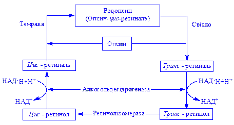 Каротинами багатий стручковий перець (853 мг/кг), червона морква, пасовищна трава, зелена конюшина, кормова морква, люцерна. Кількість вітаміну А визначається інтернаціональними одиницями, скорочено ІО. Кожна ІО містить в собі 0,68 мкг b-каротину або 0,38 мкг вітаміну А. Середня добова потреба людини тварин у вітаміні А, ІО в перерахунку на 100 кг живої маси така: людина – 2000 – 5000; корова (в період сухостою 15000 – 20000; під час лактації 10000 – 15000 + 5000 на 1 кг молока); коні 10000 – 15000; телята і лошата 10000 – 15 000; свиноматки 12000 – 15 000; поросята 12000 –15000. Потреба птахів у вітаміні А задовольняється раціонами, що містять 6000 – 10000 ІО/кг корму. Обмін вітаміну А в організмі. Вітамін А і каротини з їжею та кормами поступають в харчовий канал. Ефіри вітаміну А гідролізуються до активної форми вітаміну А – ретинолу і вищих жирних кислот. Гідроліз каротинів здійснюється каротиназою ефірів – естеразою підшлункового і кишкового соків, емульгування – жовчю. Вітамін А і частина каротинів всмоктуються слизовою оболонкою тонкої кишки, потім – через кровоносну та лімфатичну системи поступають в печінку, з неї – до інших органів і тканин, де використовуються для структурних і метаболічних потреб. У печінці нагромаджується до 90% загальної кількості вітаміну А. Невелика кількість вітаміну зосереджена також в мітохондріальній, мікросомальній і ядерній фракціях нирок, легенях, наднирниках, залозах внутрішньої секреції, молочних залозах, шкірі і, особливо, сітківці ока. Надлишок вітаміну А виділяється з калом, а в умовах патології – із сечею. В молоці різних тварин міститься 0,5 – 0,7 мг/кг вітаміну А, в коров’ячому – ще і каротинів 0,08 – 0,24 мг/кг. Значення вітаміну А для обміну речовин. Вплив вітаміну А на обмін речовин багатогранний. Механізм окремих реакцій обміну поки що не вивчений. Вважають, що вітамін А – незамінний компонент плазматичної мембрани, де він виконує функції рецептора речовин – сигналів, які мають відношення до диференціювання і морфогенезу. Здатність вітаміну А запобігати виникненню інфекційних захворювань забезпечила йому назву – антиінфекційний. При А-вітамінній недостатності сповільнюється біосинтез глікогену і прискорюється гліколіз, порушується обмін різних груп мукополісахаридів, сповільнюється біосинтез білків, зменшується вміст ліпідів. Вітамін А впливає на тканинне дихання і енергетичний обмін, оскільки від забезпеченості організму вітаміном залежать швидкість окислення трикарбонових кислот і процеси окислювального фосфорилування. Недостатня кількість вітаміну А позначається на біосинтезі кортикостероїдів, оскільки гальмується утворення стероїдного скелета на стадії перетворення сквалену в холестерин. У всіх цих реакціях вітамін може брати участь у формі спирту, альдегіду, кислоти і ефіру. Виключно важлива роль вітаміну А для зору. Фотони через зіницю поступають в заломлюючі середовища очей (рогівку, кришталик, склоподібне тіло) і на сітківку. В сітківці є два види фоторецепторів – палички і колби. Палички і колби містять зоровий пурпур, або білок родопсин. До складу родопсину входить альдегід вітаміну А 11-цис-ретиналь (хромофорна група) і білковий компонент опсин. Родопсин поглинає кванти світла. Під їх впливом 11-цис-ретиналь ізомеризується в транс-ретиналь. Відбувається фотоліз молекули родопсина. При цьому виникають еле