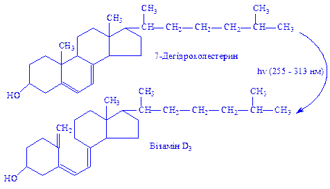 Антивітаміни. До антиметаболітів відноситься один з продуктів окислення вітаміну А оксидом ванадію – „сполука Z”. Надходження цієї речовини в організм викликає типовий авітаміноз А. Застосування вітаміну А. Раціон багатий каротином, і препарати вітаміну А застосовуються при лікуванні гіпо- і авітамінозів, при захворюванні очей, травних органів, дихальних і сечостатевих органів, дерматитах, повільній епітелізації ран і язв, аліментарній дистрофії та ін. Вітамін D. З групи вітамінів D найважливішими є два вітамери: D2 (ергокальциферол) і D3 (холекальциферол). Назва вітаміну D1 не вживається, оскільки він є неочищеним препаратом, що складається з суміші кальциферолу та інтактної речовини люмістерину. Вітамін D часто називають антирахітичним, оскільки він оберігає людину і тварин від рахіту. Гіпо- і авітамінози. За відсутності або недостатньої кількості в раціоні вітаміну D у дітей і молодняка тварин, розвивається рахіт, у дорослих – остеомаляція, у старих – остеопороз. Іноді ці явища виникають при порушенні в раціонах співвідношення Ca: P (норма 2:1 або 1:1, патологія – 3:1 або 1:2), за відсутності інсоляції і моціону. Рахіт спостерігається у дітей та молодняка тварин в період активного росту кісток, найчастіше – у поросят, лошат, телят і курчат. Найбільш чутливі до цього захворювання курчата. Ранні ознаки захворювання виявляються в міопатіях (втрата тонусу м’язів, ослаблення їх – гіпотонія). З’являється о- і х-подібна постановка кінцівок, спостерігається викривлення хребта, западає грудна клітка. Разом з тим спостерігається розростання кісткової тканини на реберних дугах – „рахітичні чотки”, з’являються „бугри” на черепі і „браслети” на епіфізах кінцівок. Внаслідок затримки процесів окостеніння кісток черепа значно збільшуються розміри голови, порушується розвиток зубів, запізнюється їх прорізування й утворення дентину. Хода стає скутою, суглоби опухають, можливе виникнення ознак тетанії. Кістки стають м’якими, легко ріжуться ножем, деформуються і не здатні протистояти механічному навантаженню. В крові різко зменшується вміст кальцію і фосфору, а в кістках – вміст фосфорнокислих солей кальцію. Спостерігаються втрата апетиту, апатія, диспепсичні явища (блювання, понос), анемія, нерідко спостерігається загибель тварин. У хворих значно зменшується вміст гемоглобіну, порушується діяльність серцево-судинної системи, знижується артеріальний тиск, збільшується розміри серця. Спостерігається підвищена збудливість, пітливість, поганий сон. Остеомаляція – захворювання організму, що характеризується розм’якшенням і деформацією кісток у результаті порушення мінерального обміну. У тварин знижується апетит (з’являється „лизуха” і поїдання неїстівних речовин), з’являється кульгавість, розхитуються зуби, викривляється або прогинається хребет, спостерігається швидка втомлюваність і залежування. Декальцинуються хвостові хребці і інші кістки скелета. У старих людей і тварин при недостатній кількості або відсутності вітаміну D, порушеннях співвідношення в раціоні Ca:P, виникає остеопороз – розрідження губчастої і компактної речовини кісток у результаті розсмоктування кісткової тканини. Виникають спонтанні переломи. Гіпервітаміноз. Виникає при надлишку в раціоні вітаміну D. З’являються гіперкальцинемія, явища диспепсії, п