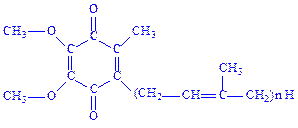 Найбільшою біологічною активністю володіє арахідонова кислота, однак у харчових продуктах її міститься незначна кількість. Ліноленова кислота малоактивна й основна її роль заключається в активації лінолевої кислоти, яка міститься у продуктах у значній кількості. При наявності піридоксину лінолева кислота перетворюється на ліноленову та арахідонову: Лінолева кислота Останнім часом до речовин, які володіють F-вітамінною активністю також відносять нонадекадеїнову, ейкозадеїнову і октадекатрієнову кислоти. Ненасичені жирні кислоти, що складають вітамін F, – це безбарвні олієподібної консистенції рідини, які не розчиняються у воді і розчиняються в органічних розчинниках, киплять при високих температурах (лінолева – 182°C, ліноленова – 184°C). Природні джерела і потреба. Ненасичені жирні кислоти містяться переважно у рослинних оліях: горіховій (63 – 76%), маковій (63 – 74%), соняшниковій (52 – 64%). Лінолева кислота входить до складу тригліцеридів рослинних олій і тваринних жирів (китового). До 30% залишків ліноленової кислоти міститься в тригліцеридах льняної олії, до 55% – перилевої олії. Арахідонова кислота – складова частина жирів рослин бобів. Добрим джерелом арахідонової кислоти є олія земляного горіха – арахісу. Потреба людини і тварин у вітаміні F вивчена недостатньо. Добова потреба в поліненасичених жирних кислотах за даними деяких дослідників складає 2 – 10 г. Обмін вітаміну F в організмі. Вітамін F поступає в організм у складі жирів. Перетравлювання і всмоктування їх аналогічно перетравлюванню і всмоктуванню жирів. Відкладається в печінці, потім з током крові поступає в різні тканини і клітини. Служить сировиною для біосинтезу більшості ліпідів. Ліпіди наднирників містять близько 20% залишків арахідонової кислоти. Обмін ненасичених жирних кислот протікає звичайним шляхом. Значення вітаміну F для обміну речовин. Біологічна активність вітаміну пов’язана з наявністю в його молекулі подвійних зв’язків. Бере участь у обміні ліпідів, у посиленні ліпотропного впливу холіна, сприяє виділенню надлишку холестерину з організму, утворюючи з ним розчинні стериди. Стінки кровоносних і лімфатичних судин після видалення нерозчинних ефірів холестерину набувають еластичності і стійкості. Впливає на стан шкірного і шерстного покриву, репродукцію і молочну продуктивність. Вітамін F стимулює дію деяких вітамінів (С, В1, В6). Вітамін B6 сприяє біосинтезу тканинами деяких жирних кислот, що входять до складу вітаміну F. Є дані відносно позитивного впливу вітаміну F при захворюваннях ендокринних залоз (гіпотиреозі), а також при різних дерматитах та екземах. Антивітаміни не встановлені. Застосування вітаміну F. У клінічній практиці застосовують лінетол – суміш тригліцеридів трьох жирних кислот, що складають вітамін F. Його одержують з льняної і соняшникової олій. Використовується при лікуванні опіків. При вживанні всередину оберігає організм від атеросклерозу. УбіхІнон. Убіхінон був відкритий у 1955 р. у складі жирів. Назва вітаміну дана у зв’язку з повсюдним розповсюдженням його в клітинах. Гіпо- і авітамінози вивчені недостатньо. Гіпервітамінози не відомі. Хімічна будова і властивості. Вітамін є похідним хінона, який містить метильну, дві метоксильних групи в ядрі і угрупування ізопрена, що складається з 6 – 10 мономерів – в бічному ланцюзі: