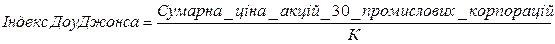 Біржові індекси. Крім наведених вище показників, що використовуються для оцінки акцій та облігацій окремих корпорацій, у статистичній практиці використовуються біржові індекси, які застосовуються для характеристики ситуації на ринку цінних паперів. При продажу і покупці акцій на фондових біржах вони є основними показниками, що визначають активність фондового ринку. Реєстрація курсів цінних паперів і публікація їх у курсовому бюлетені є однією з функцій біржі. Публічність курсів полегшує емітентам цінних паперів вирішення питань умов і доцільності нових випусків, дає можливість власникам паперів швидше орієнтуватися у кон’юнктурі фондового ринку. Крім публікації середніх курсів кожного виду цінних паперів, які мають обіг на біржі, вираховуються і публікуються середні курси акцій певних груп компаній, а також усіх компаній, зареєстрованих на біржі. Серед цих показників найвідомішими є: - на біржі в Нью-Йорку – індекс Доу-Джонса, - у Токіо – індекс Ніккей, - у Франкфурті-на-Майні – індекс ФАЦ, - у Лондоні – «Файненшл Таймс» і «Рейтер». Більшість біржових індексів характеризує середню ціну окремого набору акцій. При побудові індексу Доу-Джонса і ряду інших біржових індексів застосовується принцип рівноваги акцій поза залежністю від їх числа і вартості. Такі індекси є простим середнім арифметичним, тобто це частка від ділення суми цін акцій компаній, що розглядаються, на їх кількість. Промисловий індекс Доу-Джонса було запропоновано ще в 1897 році. Він характеризує на певну дату курс акцій 30 американських ведучих промислових корпорацій, що котируються на Нью-Йоркській фондовій біржі: