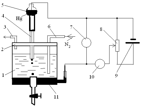 1 – полярографічна комірка; 2 – кришка; 3 – трубка для виводу азоту; 4 – капіляр; 5 – сосуд зі ртуттю; 6 – трубка для вводу азоту; 7 – вольтметр; 8 – реостат; 9 – джерело живлення; 10 – мікроамперметр; 11 – донна ртуть. Рисунок 3.30 - Принципова схема полярографу