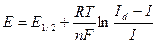 На відрізку аб струм змінюється у незначній мірі, цей струм звуть остатнім, який зумовлений розрядом домішок. З точки б зріст струму якби попереджує зріст потенціалу електроду – електрод деполяризується. Потенціал у точці б зветься потенціалом виділення, при цьому потенціалі починається електрохімічна реакція. На електроді зі значною поверхнею густина струму незначна і його потенціал практично залишається сталим. На мікроелектроді густина струму значна, його рівноважний потенціал змінюється, при цьому зменшується концентрація іонів у поверхні мікроелектроду Сs у зрівнянні з їх концентрацією у глибині С0. При цьому збільшується швидкість їх дифузії із розчину. Коли всі іони, що підходять з розчину, будуть миттєво розряджатися, їх концентрація на поверхні мікроелектроду стане дорівнювати нулю, і різниця Сs - С0 стане максимальною і сталою. З цього моменту(точка в) швидкість дифузії іонів і сила струму також становляться максимальними і сталими, і не залежать від потенціалу. Цей струм зветься дифузійним Іd. З подальшим збільшенням напруги почнеться розряд іншого катіону, або фонового електроліту і буде спостерігатися нове збільшення струму(точка г). Графічне зображення поляризації електроду від напруги зветься вольт амперною кривою, полярографічною хвилею, або полярограмою. Рух іонів може відбуватися не тільки за рахунок дифузії, але і під дією електричного поля(міграція) і за рахунок зміни густини розчину(конвекція). Для запобігання міграційного струму у розчин вводять значну кількість електроліту, який не приймає участі у електрохімічній реакції(фоновий електроліт). Він екранує електрод, зменшує міграцію іонів, що визначаються, практично до нуля. Крім того він збільшує електропровідність розчину. Рух іонів за рахунок конвекції ліквідують перемішуванням розчину. Класичний полярографічним метод зводиться до побудови кривих залежності струму від напруги і їх аналізу. Рівняння оборотної полярографічної хвилі(якщо реакція перебігає оборотне) має вигляд: