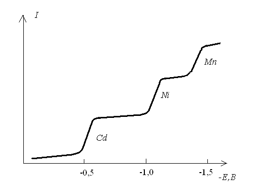 де Е1/2 – потенціал півхвилі. Якщо: І=1/2Іd то: Кількісні визначення засновані на залежності дифузійного струму від концентрації визначаємого іону. Якщо підтримувати сталими умови вимірювань, то дифузійний струм пропорційний концентрації визначаємої речовини у широкому інтервалі концентрацій: Id = кС0, де к – коефіцієнт, який залежить від властивості електроду, природи іону і умов вимірювання. Таким чином Id визначає концентрацію іону. Якщо у розчині міститься декілька речовин, то полярограма буде мати вигляд як на рисунку 3.32. Для фонового електроліту 0,1 М КСl потенціали півхвилі складають: E1/2Cd = -0,6B, E1/2Ni = -1,1B, E1/2Mn = -1,4B. Сучасні варіанти вольтамперометрії різноманітні. Це осцилографічна полярографія, імпульсна, змінно-токова та інші. Приваблює метод інверсійної вольтамперометрії, який дозволяє визначати неорганічні і органічні речовини з концентрацією до 10-9 – 10-10 М. У цьому методі використовують попереднє концентрирування визначаємої речовини на поверхні індикаторного електроду. Електроліз здійснюють при потенціалі предільного струму відновлення речовини при інтенсивному перемішуванні розчину впродовж певного часу. Після цього вмикають розгортку потенціалу і реєструють полярограму виділення(окиснення визначаємої речовини).