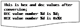 void printer(int arg[]) { int i; printf("This is hex and dec values after conversion\n"); ///вивід результатів на екран for(i=0;i<sizeof(arg);i++){ printf("DEC value number %d is %d\n", i, arg[i]); ///вивід результатів на екран у десятковому форматі/// printf("HEX value number %d is 0x%X\n", i, arg[i]); ///вивід результатів на екран у шістнадцятирічному форматі/// }