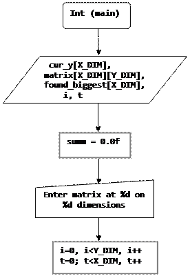 main(){ ////Створює масив завдовжки X_DIM, в який потім запишеться адреса найбільшого числа в стовпці int cur_y[X_DIM]; ////Створює двовимірний масив, з яким проводитимуться операції matrix[][] і масив для знайдених максимумів float matrix[X_DIM][Y_DIM], found_biggest[X_DIM]; ////Лічильники int i, t = 0; ////Змінна для суми float summ = 0.0f; ////Виводить запит на введення даних, натякаючи на розміри матриці в пристрій стандартного виводу printf("Enter matrix at %d on %d dimensions\n", X_DIM, Y_DIM); ////Поки i менше Y_DIM перемикаються рядки for(i=0; i<Y_DIM; i++){ ////Поки t менше X_DIM перемикаються стовпці for(t=0; t<X_DIM; t++){ ////Друкує запит на введення даних за поточною адресою в матриці в пристрій стандартного виводу printf("Number at [%d]x[%d]="t, i); ////Прочитує введення за поточною адресою в матриці. scanf("%f", &matrix[t][i]); } } ////Поки i менше X_DIM (кількості стовпців) - перемикає стовпці від 0 до X_DIM for (i = 0; i<X_DIM; i++){ ////Призначає масиву для знайдених максимумів за адресою лічильника стовпців знайдений максимум в цьому стовпці found_biggest[i]=biggest_in_column(matrix, i, cur_y); ////Друкує знайдений максимум в стовпці в пристрій стандартного виводу, вказуючи номер стовпця, само число і де в стовпці воно було знайдене printf("Biggest in column %d is %0.2f at %d\n", i, found_biggest[i], cur_y[i]); ////Підсумовує поточний максимум з попереднім значенням (чи нулем, якщо це перший) summ = summ + found_biggest[i]; } ////Під кінець програми виводить суму максимумів printf("Summ is %0.2f", summ); return 0; } ////Сама функція пошуку максимуму в стовпці. Їй передається матриця, яка локально буде названа local_matrix ////а так само номер поточного стовпця і _покажчик_ на масив з адресами максимумів. ////float biggest_in_column(float local_matrix[X_DIM][Y_DIM], int column, int cur_y[Y_DIM]) float biggest_in_column(float local_matrix[X_DIM][Y_DIM], int column, int *cur_y){ ////Лічильник int i = 0; ////Задає поточний максимум як нуль, що б не було помилок float current_biggest = 0.0f; ////Поки лічильник менше висоти стовпця for (i=0; i<Y_DIM; i++){ ////Порівнює чи більше поточне значення в цьому стовпці і в цьому рядку того, що зараз вважається максимумом і якщо так if(current_biggest<local_matrix[column][i]){ ////призначає максимуму поточне значення в цьому стовпці і в цьому рядку, current_biggest=local_matrix[column][i]; ////а так само записує в якому місці знаходиться це значення у цього стовпця cur_y[column]=i; } } ////Повертає максимум в стовпці return current_biggest;