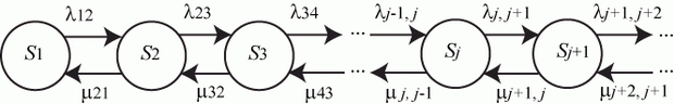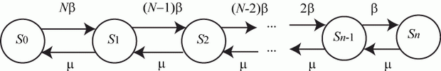 Название модели - "гибель и размножение" - связано с представлением, что стрелки вправо означают переход к состояниям, связанным с ростом номера состояния ("рождение"), а стрелки влево - с убыванием номера состояний ("гибель").