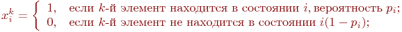 Система имеет элементов, а каждый элемент имеет состояний. Численность -го состояния на любой момент времени - величина случайная. Обозначим ее . Матожидание и дисперсия этой случайной величины: