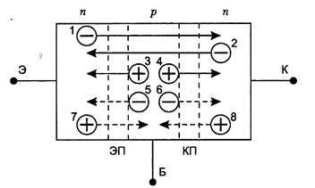 Через открытые переходы протекают основные носители заряда (они обозначены стрелками и цифрами от 1 до 4), через закрытые переходы — потоки неосновных носителей заряда (они обозначены пунктирными стрелками и цифрами от 5 до 8).