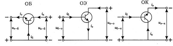 Возможны три схемы включения: схема с общей базой (ОБ), схема с общим эмиттером (ОЭ) и схема с общим коллектором (ОК).