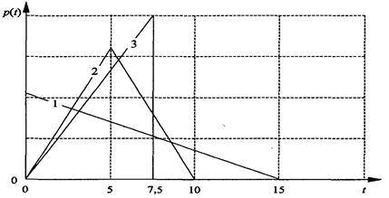 Рис.1.3. График плотности вероятностей для треугольного распределения: 1 - максимум слева; 2 - максимум в центре; 3 - максимум справа Первый случай. Допустим, что администратор базы данных (системный программист) осуществил физическую организацию данных, которая обладает следующими свойствами: • наиболее вероятное время ответа на запрос близко к 0 с; • минимальное вероятное время ответа не менее 0 с; • максимальное вероятное время ответа не превьппает 15 с; • распределение вероятностей представлено линией 1 на рис. 1.6. Этот системный программист обеспечил минимальное время для наиболее вероятных запросов за счет увеличения времени для менее вероятных. Среднее время получения ответа в этом случае t = 5 с. Второй случай. Администратор базы данных по просьбе пользователей решил уменьшить время ответа на те запросы, которые редко возникают. Для этого он переделал физическую организацию данных и получил следующие ее свойства: • наиболее вероятное время ответа на запрос равно 5 с; • минимальное вероятное время ответа не менее 0 с; • максимальное вероятное время ответа не преЬьпиает 10 с; • распределение вероятностей показано линией 2 на рис. 1.6. Таким образом, системный программист обеспечил снижение времени ответа для менее вероятных запросов за счет увеличения времени ответа для наиболее в^оятных. Среднее время получения ответа осталось тем же: t = 5 с. Третий случай. Администратор базы данных решил еще более уменьшить время ответа на менее вероятные запросы. Для этого он опять переделал физическую организацию данных и получил следующие свойства: • наиболее вероятное время ответа на запрос равно 7,5 с; • минимальное вероятное время ответа не менее 0 с; • максимальное вероятное время ответа не превышает 7,5; • распределение вероятностей изображено линией 3 на рис. 1.6. Этот системный программист обеспечил дальнейшее снижение времени ответа для менее вероятных запросов за счет увеличения времени ответа для более вероятных. Среднее время получения ответа и в этом случае не изменилось: t = 5 с. Возникает естественный вопрос: «Какая физическая организация лучше?». Если отбросить факторы, определяющие большую или меньшую важность запросов, и вспомнить, что база данных не имеет множественного доступа из вычислительной сети, то можно утверждать, что все три способа организации данных одинаковы, так как пользователи этой базы имеют одно и то же среднее время ответа. Однако если подключить компьютер с нашей базой к локальной вычислительной сети и разрешить доступ к базе данных большому числу пользователей этой сети из рабочих компьютеров этих пользователей, то необходимо учитывать возникновение очереди запросов к базе данных при ее монопольном использовании. Предположим, что число пользователей довольно велико и выполняются условия предельной теоремы о суперпозиции потоков событий (в нашем случае возникновение запроса к базе данных – это событие). Тогда поток запросов к базе простейший (экспоненциальное распределение интервала поступления). Поэтому выполняются условия, при которых справедлива следующая формула для оценки средней задержки запросов в очереди (формула Поллачека- Хинчина):