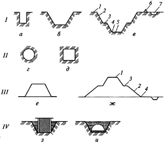 Каналы Плотины Плотины Карьеры (соср. выемка) Траншеи Дамбы Дамбы Резервы (лин. выемка для лин. насыпи) Карьеры Дороги Каналы Отвалы (соср. склад грунта) Котлованы Обр. засыпки Котлованы Кавальеры (лин. насыпь от линейной выемки) Подземные Кюветы (лин. канава для сбора воды)