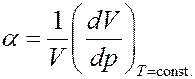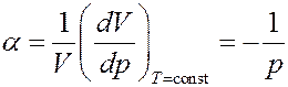 Сжимаемость газа при изотермическом процессе характеризуется изотермическим коэффициентом сжимаемости α, который определяется как относительное изменение объема, изменяющее давление на единицу.