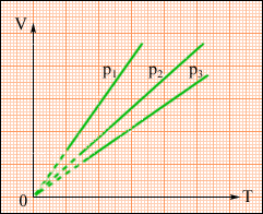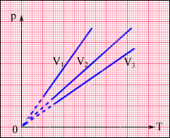 На диаграмме (p, T) изохорные процессы для заданного количества вещества ν при различных значениях объема V изображаются семейством прямых линий, которые называются изохорами. Большим значениям объема соответствуют изохоры с меньшим наклоном по отношению к оси температур (рис. 4).