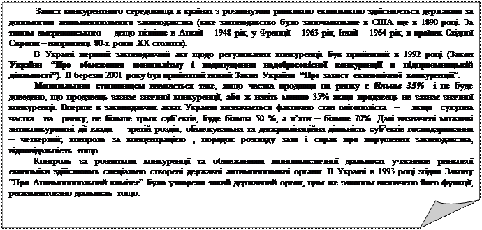 За чистої (досконалої) конкуренції існує дуже велика кількість виробників і продавців стандартизованої продукції, при цьому споживачу байдуже в кого він купуватиме цю продукцію, питома вага виробника (продавця) в загальній пропозиції даного товару настільки мала, що ні один з них не може впливати на ціну ринкової рівноваги. Вхід і вихід виробників в галузь вільний, відсутні обмеження щодо інформації про стан ринку, ціни, затрати, технологію тощо. Якщо на ринку є ще й багато покупців, то такий ринок називається поліполія (повна конкуренція). В сучасній економічній системі більшості розвинутих країн домінуючою є монополістична конкуренція. Вона означає ринкову ситуацію, за якої існує відносно велика кількість виробників (продавців), але значно меншу чим за досконалої конкуренції. Продукти, що пропонуються на ринку за умов монополістичної конкуренції, хоча і належать до однієї товарної групи, є досить диференційовані. Тут існують нецінові методи конкуренції (різна упаковка, реклама, якість товару, сервісне гарантійне обслуговування тощо). Тут існує обмежена можливість продавця впливу на ціну. За олігополії ( від грецького слова олігос – мало, небагато ) на ринку є лише декілька (3-4) продавці, які узгоджують між собою ціни та обсяги виробництва, кожний з них володіє значною питомою вагою пропозиції даного товару. І будь-які дії одного з олігополістів впливатимуть на іншого. Однією із негативних рис ринкової економіки є те, що ринок породжує монополії і монополістичні тенденції в економічній частині. За чистої монополії (від грецького monos – один і poleo – продаю) на ринку однорідного продукту чи послуги працює одна фірма, входження нових виробників в галузь заблоковане, виробник може визначально впливати на обсяги виробництва і пропозиції товару, його ціну тощо. Таким чином, монополія є протилежністю, антиподом конкуренції, хоча і виростає з неї. На ринку може існувати не тільки один продавець, а й один покупець. Така економічна структура, коли на ринку існує лише один покупець називається монопсонією (від грецького monos – один і opsonia – купую). В деяких галузях зустрічається своєрідна білатеральна монопсонія (в сфері виробництва воєнної продукції є один замовник – держава, а виробник – єдина фірма). Між тим, чиста монополія і чиста монопсонія – порівняно рідкісне явище. Практика засвідчує, що залежно від характеру і причин виникнення є такі види монополій: природна, легальна, штучна. Природна монополія існує в галузях, які виробляють рідкісні метали та інші елементи виробництва (бирилієва монополія в США), а також в галузях інфраструктури, що мають важливе і стратегічне значення, контроль над яким має здійснюватися з боку держави (наприклад виробництво ядерної зброї). Як правило існування природних монополій зумовлено тим, що розподіл випуску продукції між двома і більшою кількістю фірм призведе до ситуації коли масштаби кожної з них будуть неефективно малі. Легальні (закриті) монополії утворюються і існують на законних підставах для надання особливих послуг (зв’язок, залізничний транспорт, водопостачання, газопостачання, енергопостачання, органи, що надають авторські права – патенти, ліцензії тощо). Штучна (відкрита) монополія виникає внаслідок особливого становища підприємства для одержання монополістичних переваг (напри