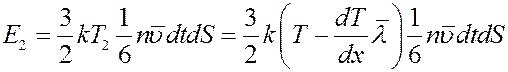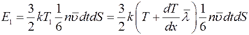 Через площадку dS проходят молекулы как слева направо, так и справа налево и если давление газа везде одинаково, то число молекул, которые проходят через площадку слева и справа за время dt очевидно одинаково. Однако молекулы, которые проходят слева движутся из области с более высокой температурой, чем те, которые проходят через площадку справа. Поэтому возникает поток теплоты, равный разности энергий переносимых молекулами слева и справа. Последние столкновения перед площадкой dS слева и справа, будут происходить на расстояниях