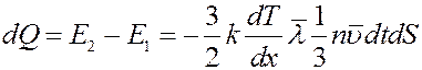 С учетом этого количество теплоты (энергия), которая переносится молекулами через площадку dS, будет равна разности кинетических энергий молекул проходящих через площадку.