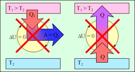 Рис.2 Процессы, не противоречащие первому закону термодинамики, но запрещаемые вторым законом: 1 – «вечный двигатель второго рода»; 2 – самопроизвольный переход тепла от холодного тела к более теплому («идеальная холодильная машина»).