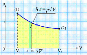 Графически работа изображается площадью фигуры, лежащей под кривой p (V) (рис.1) и численно равна площади под кривой 1→2.
