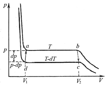 Кривая p (T) начинается в тройной точке и заканчивается в критической точке. Как видно из графика p (T) равновесие двух фаз пар – жидкость может существовать только в некотором интервале температур и давлений. Очевидно, что кривая зависимости давления насыщенного пара от температуры совпадает с кривой зависимости температуры кипения от давления. При давлении 3570 мм.рт.ст. (~5 атмосфер) вода кипит при 150 oC, а при давлении 4 мм.рт.ст. при 0 oC. Две любые фазы вещества могут находиться в равновесии только при определенном давлении и температуре. Определим связь между этими параметрами. Рассмотрим цикл Карно для системы состоящей из двух фаз вещества, находящихся в равновесии при температуре T и давлении p, например: жидкость - насыщенный пар (рис.3):