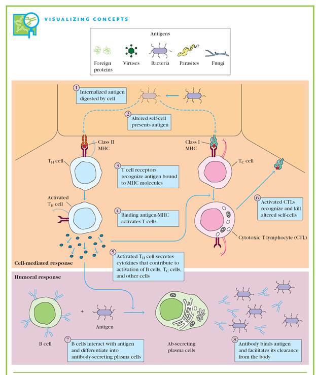As mentioned earlier, immune responses can be divided into humoral and cell-mediated responses. Humoral immunity refers to immunity that can be conferred upon a nonimmune individual by administration of serum antibodies from an immune individual. In contrast, cell-mediated immunity can be transferred only by administration of T cells from an immune individual. The humoral branch of the immune system is at work in the interaction of B cells with antigen and their subsequent proliferation and differentiation into antibody-secreting plasma cells (Figure 2, 3, 4). Antibody functions as the effector of the humoral response by binding to antigen and neutralizing it or facilitating its elimination. When an antigen is coated with antibody, it can be eliminated in several ways. For example, antibody can cross-link several antigens, forming clusters that are more readily ingested by phagocytic cells. Binding of antibody to antigen on a microorganism can also activate the complement system, resulting in lysis of the foreign organism. Antibody can also neutralize toxins or viral particles by coating them,which prevents them from binding to host cells. Effector T cells generated in response to antigen are responsible for cell-mediated immunity (see Figure 2). Both activated TH cells and cytotoxic T lymphocytes (CTLs) serve as effector cells in cell-mediated immune reactions. Cytokines secreted by TH cells can activate various phagocytic cells, enabling them to phagocytose and kill microorganisms more effectively. This type of cell-mediated immune response is especially important in ridding the host of bacteria and protozoa contained by infected host cells. CTLs participate in cell-mediated immune reactions by killing altered self-cells; they play an important role in the killing of virusinfected cells and tumor cells.