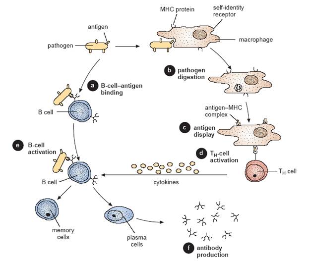 FIGURE 4 Production of antibodies in the specific immune response. Pathogenic cells may bind to aB-cell surface receptor (a), or be engulfed by a macrophage (b). The macrophage digests thepathogen and displays its antigens along with MHC molecules on the macrophage’s plasmamembrane (c). Helper T cells (TH) bind to the antigens displayed on the macrophages and Bcells and become activated (d). Activated TH cells begin to produce cytokines. Some cytokinesstimulate microorganism-bound B cells to produce a clone of identical plasma cells (e), whichsecrete thousands of antibodies to the pathogen into the bloodstream (f). Other cytokinesstimulate TH cells to divide and produce still more cytokines.