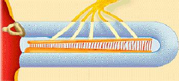 Рис. 7.10. Внутреннее ухо. Частотный диапазон слышимых звуковых колебаний. Согласно [24], человеческое ухо воспринимает звуковые волны длиной примерно от 1,6 см до 20 м, что соответствует частотному диапазону 16-20 000 Гц. Частотный диапазон человеческой речи - 300-4000 Гц. Надо заметить, что разборчивость речи остается вполне удовлетворительной при ограничении этого диапазона до 300-2400 Гц. Частотный диапазон обычных телефонных каналов еще меньше, однако, это не сказывается заметным образом на разборчивости речи.