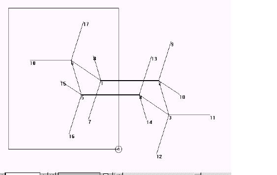 Измерение Свойств Минимизированной Системы Управление Вычислениями Вы закончили регулировать переменные для оптимизации и готовы к началу вычисления. 1. L-щелчок на OK к закрытию ячейки диалога и старту вычисления. Оптимизация геометрии начинается и информация в движении появляется на линии состояния. Через какой то промежуток времени, движение заканчивается. Следующие значения появляется на линии состояния: Энергия: 1.33 Градиент: 0.07 Градиент - намного меньше, чем градиент, измеренный в сформированной модельной структуре перед минимизацией. Число циклов - число используемых направлений поиска (и Флетчер-Ривес, и Polak-Ribiere используют ряд одномерных исследований) и число точек - число оценок градиента и энергии. Теперь сравните структурные свойства минимизированной системы с таковыми сформированной модельной структуры. 1. Выберите различные связи, углы, и торсионные углы. Когда Вы делаете ваши выборы, появляется значения на линии состояния,: Длина связи: 1.53Å Углы: 110.2 град Скручивания: 58.0 град 2. Сравните эти значения со следующими значениями у не минимизированной структуры: Длины связи: 1. 54Å Углы: 109.4 град Скручивания: 60 град Сравнение свойств структуры показывает, что минимизация энергии увеличила немного тетраэдрический угол и длину связи и уменьшила торзионный угол на 2 градуса. В этом упражнении, Вы поднимаете (отражаете) один конец молекулы, чтобы вывести форму ванны для циклогексана. Определить отражательную плоскость: 1. Пометить Multiple Selections. 2. Если Вы не в инструменте выбора, L-щелчок на инструменте Selection. 3. Сделать двойной щелчок на инструменте Selection, чтобы возвратиться сформированной структурной модели. 4. L-щелкнуть на связях 1-2 и 4-5, чтобы выбрать отражательную плоскость, показанную здесь: 5. Выбрать Name Selection на меню Select. 6. Выбрать PLANE, и затем нажмите OK. Отражать один конец молекулы: 1. Если необходимо, Выберите Show Hydrogens и использовать Zoom tool, чтобы масштабировать молекулу так, чтобы вся молекула была видна. 2.Сделать LR-вытягивание, чтобы включить в выбор все атомы по одну сторону от первоначально выбранных связей. 3. Выбрать Reflect на меню Edit. Выбранные атомы отражены через PLANE, производя преобразование циклогексана в ванну. Структура должна теперь напоминать эту: 4. R - щелкнуть в пустой области рабочего пространства для снятия выделения атомов.