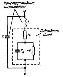 Статическая характеристика туннельного диода и его эквивалентная схема на участке с отрицательным сопротивлением.
