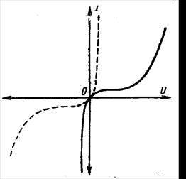 Особенность обращенного диода состоит в том, что отсутствует (или очень мал) максимум на прямой ветви. В этом случае логично повернуть характеристику на 180о (показано пунктиром) и считать прямую ветвь обратной, а обратную – прямой. Таким образом, обращенный диод имеет значительно меньшее прямое напряжение, чем плоскостные диоды (однако, обратное напряжение тоже весьма мало (0,3 - 0,5 В)).