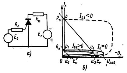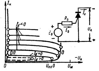 Структура динистора (а) и его транзисторный эквивалент (б); вольт-амперная характеристика динистора (в).