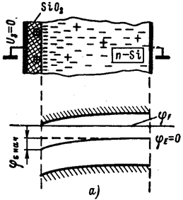 Распределение носителей и зонные диаграммы в МОП транзисторе с индуцированным p-каналом: (а) – равновесное состояние, (б) – при отрицательном смещении на затворе.