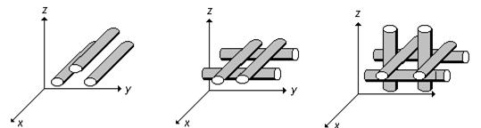 Наполнителями в них служат волокна или нитевидные кристаллы: углеродные, борные, из SiC, Al2O3, стекла, а также проволока из коррозионно-стойкой стали, молибдена, вольфрама, бериллия. Волокна являются элементами, воспринимающими нагрузку. Для матриц используются те же металлы, что и для предыдущей группы. Для достижения максимальной прочности композиционного материала волокна должны быть расположены параллельно направлению действия напряжения. Поэтому расположение волокон может быть одноосным, двухосным или трехосным (рис. 119).