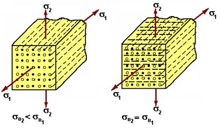 При одноосном армировании проявляется анизотропия: в направлении волокон прочность выше, чем в поперечном (так как нагрузку воспринимает волокно, а матрица – передающая среда). При двухосном армировании анизотропии нет, но прочность вдоль оси волокон уменьшается примерно в 3 раза (рис. 120).