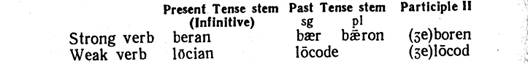 (The Past tense stem of the weak verbs is the form of the 1st. and 3rd p. sg; the pl lōcodon is formed from the same stem with the help of 114 the plural ending -on). The same ending marks the Past pl of strong verbs. (Note the lack of ending in the form of the strong verb b æ r and the ending -de in the same form of the weak verb.) Both the strong and the weak verbs are further subdivided into a number of morphological classes with some modifications in the main form-building devices. Minor groups of verbs differed from the weak and strong verbs but were not homogeneous either. Some of them combined certain features of the strong and weak verbs in a peculiar way ("preterite-present" verbs); others were suppletive or altogether anomalous. The following chart gives a general idea of the morphological classification of OE verbs.