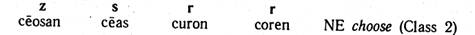 Direct traces of reduplication in OE are rare; they are sometimes found in the Anglian dialects and in poetry as extra consonants appearing in the Past tense forms: Past tense of hātan – heht alongside hēt ('call'), Past tense of ondr edan – ondrēd and ondrēord (NE dread). To account for the interchanges of consonants in the strong verbs one should recall the voicing by Verner's Law and some subsequent changes of voiced and voiceless fricatives. The interchange [s~z] which arose under Verner's Law was transformed into [s~r] due to rhotacism and acquired another interchange [s~z] after the Early OE voicing of fricatives. Consequently, the verbs whose root ended in [s] or [z] could have the following interchange: