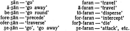 The most frequent, and probably the most productive, OE prefixes were: ā-, be-, for-, fore-, e·, ofer-, un-. Of these only un- was common with nouns: and adjectives, the rest were mainly verb prefixes. The prefix modified the lexical meaning of the word, usually without changing its reference to a part of speech: e-boren ─ un eboren (adjectivised participle; NE born ─ unborn); sip ─ for-sip n ‘journey’, ‘death’; d ed ─ un-d ed n NE deed ‘crime’; īepelīce ─ un- īepelice adv ‘easily’, with difficulty’, spēdi ─ unspēdi adj ‘rich’, ‘poor’. Some prefixes, both verbal and nominal, gave a more special sense to the word and changed its meaning very considerably: e.g. ytan —on- ytan (NE get), 'perceive', weorðan ─ for-weorðan v, forwyrð n ‘become’, ‘perish’, ‘destruction’, bū an ─ bebū an (NE bow), 'surround'. A distinct semantic group was constituted by negative prefixes un-, mis-, wan-, or- (the two latter were nominal prefixes only), e.g.: hāl ─ unhāl or wan-hāl 'healthy', 'unhealthy', wīsdōm ─ unwīsdōm (NE wisdom), 'folly'; līcian ─ mislīcian (NE like), 'displease', limpan or elimpan─ mislimpan 'happen' ─ 'go wrong', sor n ─ orsor adj (NE sorrow), 'unconcerned, careless'. Some prefixes had a very weak or general meaning bordering on grammatical, e.g.: e -, the commonest verb prefix, conveyed the meaning of result or completion and was therefore often used as a marker of the Past Participle ─ sittan ─ e-sett, stelan ─ estolen (NE sit, steal). e- and ā- changed the aspective meaning of the verb and turned it from durative into perfective or terminative without affecting its lexical meaning as in feran ─ eferan 'go ─ reach', drincan ─ e-drincan 'drink ─ drink off, winnan ─ ewinnan 'fight ─ win', sendan ─ āsendan 'send ─ send off. With some verbs the meaning of the prefix was so weak and vague that there was practically no difference between the verb with the prefix and without it, e.g.: ābīdan ─ bīdan 'await', swerian ─ āswerian 'swear'. With other verbs the same prefix could bring about a shift of meaning, e.g.: sittan ─ e-sittan 'sit ─ occupy'.