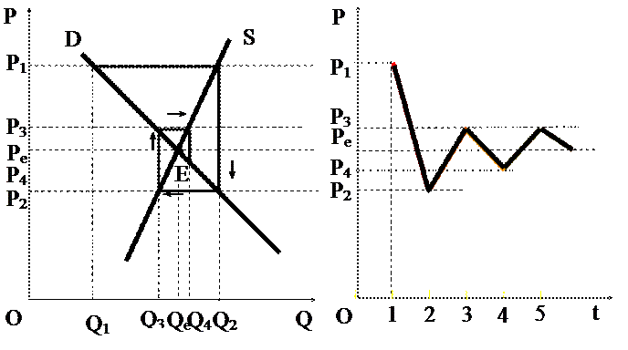 EXPLANATION: Assume that this represents the market for X-good. The current price is Pe and quantity bought and sold Qe. Assume that prise rises from Pe to P1. At the current market price of Pe there will be a surplus created – buyers cannot easily increase the demand of X-good in the short run. This would cause the price to fall (P2). The lower price encourages consumers to buy more goods – the damand at the end of the period will increase to Q2. The increased demand at a price of P2 however is met with a reduction in quantity supplied. It means that there is shortage in the market. As a result the price increases to P3 level. The higher price persuades produsers to increase production quantity for the next period (Q4). At P3 the lower demand means a surplus is created press the price down to P4. This will encourage buyers to expand consumption to Q4. … This process will continue until the price reaches equilibrium. This is termed a ‘convergent cobweb’. A convergent cobweb leads to price stability over time.