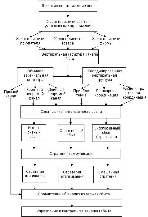 Рис. Последовательность решений по каналам сбыта Таким образом, наличие канала сбыта подразумевает распределение функций и потоков между участниками обмена. Ключевой вопрос при организации сети не в том, должны ли существовать эти функции и потоки, но скорее в том, кто из участников канала будет их выполнять. Можно наблюдать большое разнообразие в распределении функций не только для разных рынков, но и в пределах одного рынка. Высокий уровень затрат постоянно побуждает предприятия к поиску более совершенных методов сбыта. При этом очевидно, что функции сбыта можно передать, но их нельзя исключить. С точки зрения фирмы, передача указанных функций посредникам оправдана в той мере, в которой они благодаря своей специализации способны выполнять их более эффективно и с меньшими затратами. Привилегированное положение сбытовиков (дистрибьюторов) обусловлено пятью факторами:
